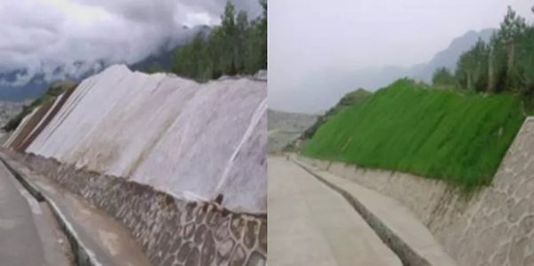 (5)覆蓋無紡布:為了保種子的發(fā)芽率,選用13g/mz的無紡布從上至下進(jìn)行鋪蓋。用竹簽或U型釘固定,注意保持搭界。無紡布的覆蓋起到保水保溫的作用并對(duì)防止發(fā)芽期雨水對(duì)坡面的沖刷。無紡布的覆蓋待苗出齊后揭除。