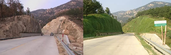 (7)治理效果:噴播完工后,種子在7~10天內(nèi)萌動(dòng)發(fā)芽,15~20天齊苗,三個(gè)月內(nèi)成坪,三個(gè)月后覆蓋率達(dá)到85%以上,水土保持初步成效,一年后灌木、藤本生長(zhǎng)茂盛,逐步恢復(fù)自然生長(zhǎng)狀態(tài),徹底達(dá)到水土保持,恢復(fù)生態(tài)的根本目的。
