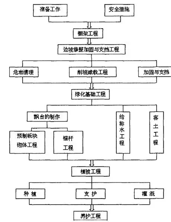 建造植生槽綠化技術(shù):又叫飄臺(tái)種植槽法。是一種專門針對(duì)高、陡巖石邊坡快速生態(tài)修復(fù)的新型綠化技術(shù)。經(jīng)過多次實(shí)踐對(duì)比,該技術(shù)是目前對(duì)付坡度≥75℃ 的巖石邊坡快速生態(tài)修復(fù)、水土保持和美化環(huán)境的最為有效的一種方法之一。